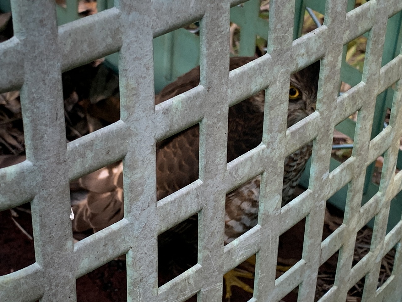 このままでは危ないと感じ、保護を決意。 オオタカは確か環境省のレッドリスト(現在は準絶滅危惧種)に入っていたはず。逃げようとしない様子から、まだ飛べないのだろうと判断し、とりあえずカゴで一時的に保護しました。数時間様子を見て、元気になったら放そうという考えでした。