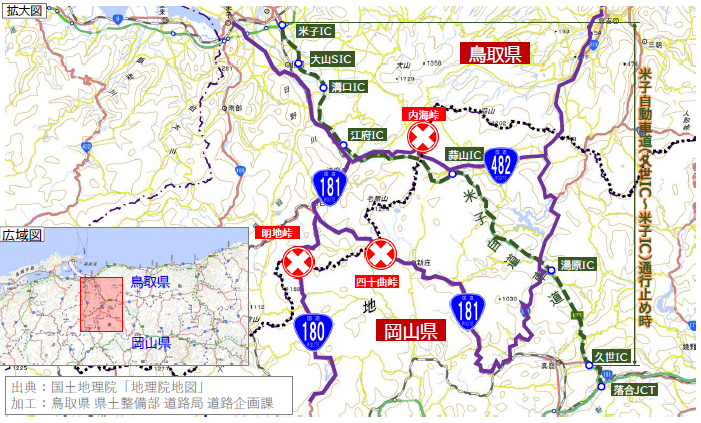 米子道が止まっている場合、**「鳥取道」か「人形峠」**へ大きく回るのが基本です。