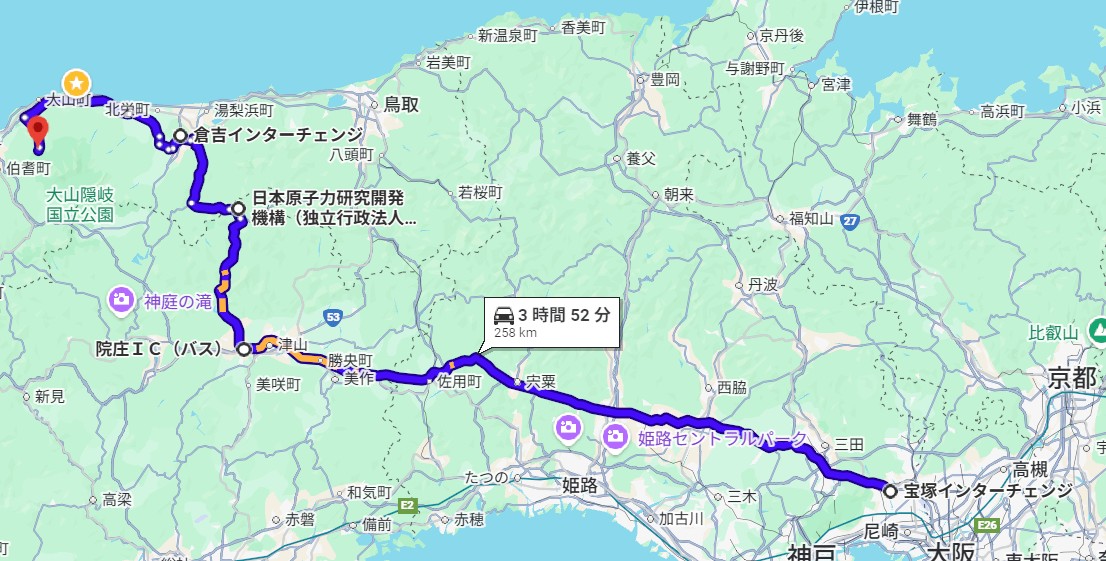 | 【推奨】Aルート | 中国道(佐用JCT)⇒ 鳥取道 ⇒ 山陰道 ⇒ 大山IC | 無料区間が多く、除雪体制も比較的安定しています。 |