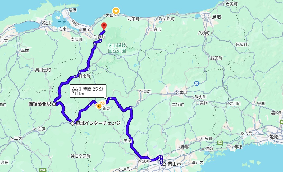 | Bルート | 中国道(院庄IC)⇒ 国道179号(人形峠) ⇒ 倉吉 ⇒ 山陰道 ⇒ 大山IC | 倉吉経由で大山へ向かうルート。峠越えがあるため冬用装備必須です。 |