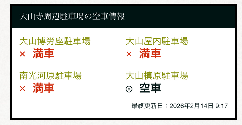 大山ホワイトリゾート駐車場満車時刻(2026年2月14日)
